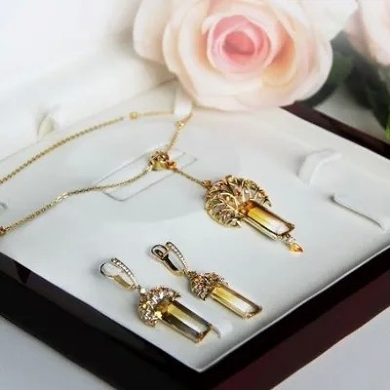Вставка: 8 Бриллиант Кр 57 (200 400) 0.066 сt 3/5А; 1 Бриллиант Кр 57 (200 400) 0.100 сt 4/4А; 20 сапфир цв. облаг. 1,856 сt; 1 Полихромный кварц 11,96 сt.